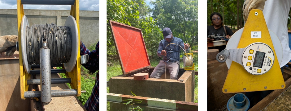 These measurements can be done manually with a dip meter, which involves dropping a probe down the borehole and unwinding a graduated tape until the probe contacts water, triggering an audio or visual alert.