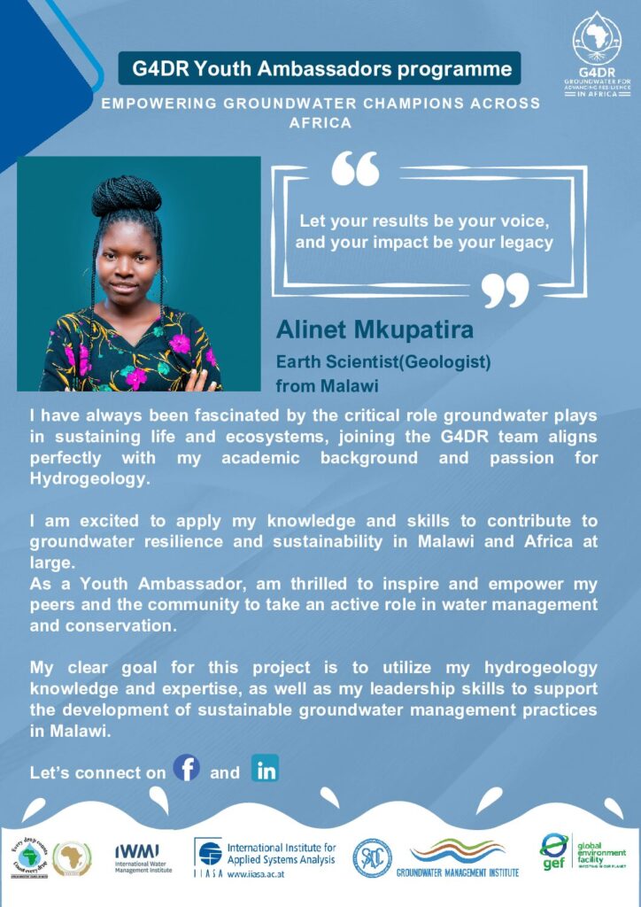 “I have always been fascinated by the critical role groundwater plays in sustaining life and ecosystems. Joining the G4DR team aligns perfectly with my academic background and passion for Hydrogeology. My goal is to use my knowledge and leadership skills to support sustainable groundwater management in Malawi.”